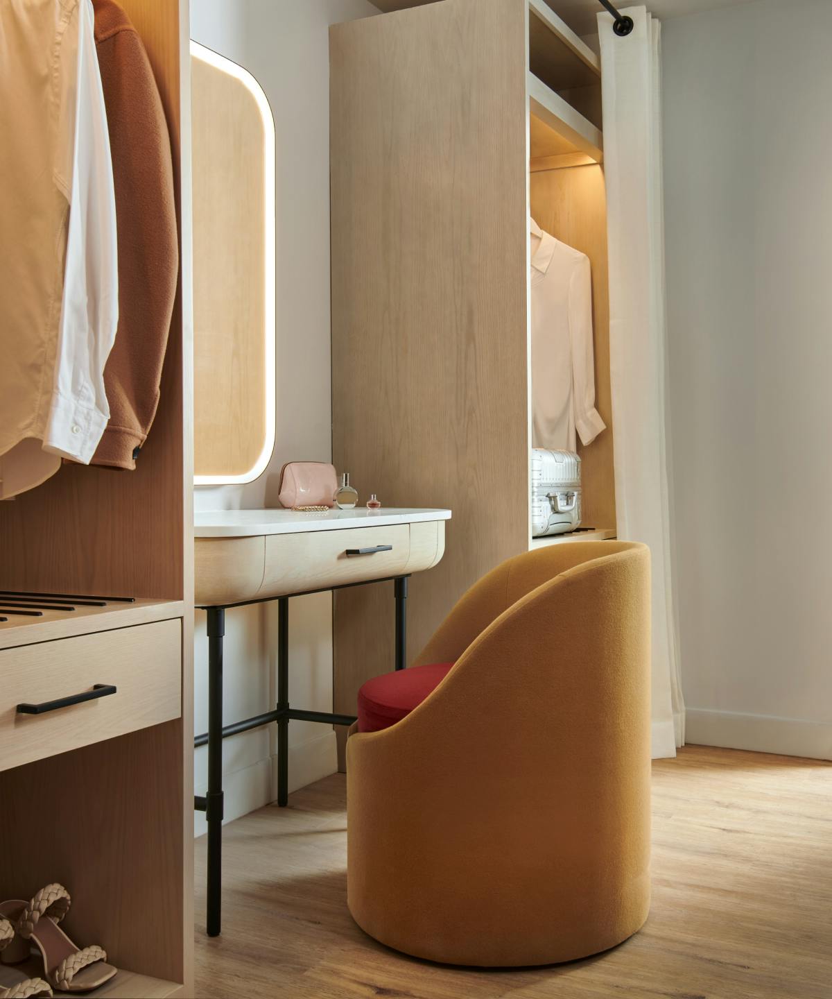 - Makeup vanity with mounted illuminated mirrors